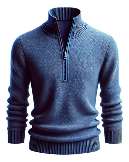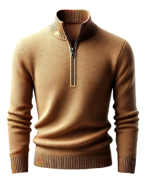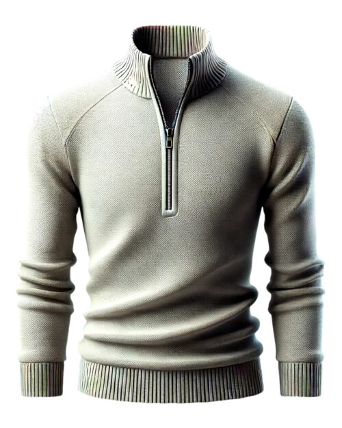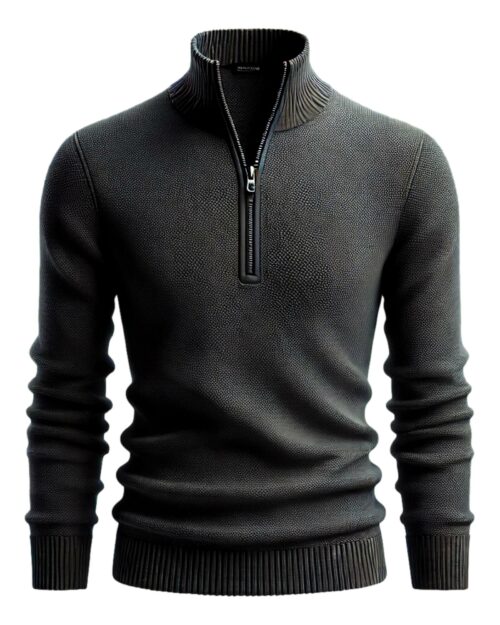 The stand-up collar sweater comes in a regular fit and features a troyer collar and zipper that can be closed on colder days.